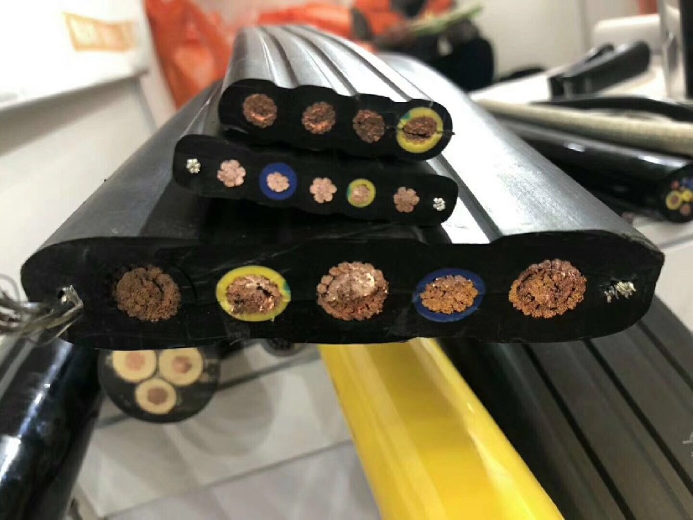 行车电缆主要应在行车,天车,起重机,大型吊机,龙门吊等,需往返移动的场合,并为其提供电力输送,信号控制等。该电缆采用扁平结构设计,通常采用悬挂随行移动安装方式,电缆随设备的运行而随行移动伸缩使用。设计电缆采用一字型或梅花型的芯线结构设计,以控制电缆成品尺寸。对于行程距离较长的,或对抗拉要求较高的,可置入镀锌抗拉软钢丝绳,以增强电缆的抗拉性能。对于抗电磁干扰要求较高的,可置入镀锡铜丝编织的高密度屏蔽网层,以有效对抗电磁干扰。