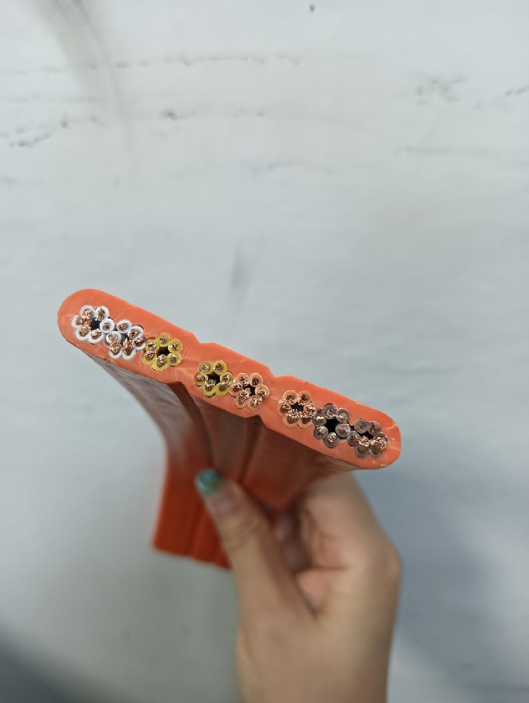行车电缆主要应在行车,天车,起重机,大型吊机,龙门吊等,需往返移动的场合,并为其提供电力输送,信号控制等。该电缆采用扁平结构设计,通常采用悬挂随行移动安装方式,电缆随设备的运行而随行移动伸缩使用。设计电缆采用一字型或梅花型的芯线结构设计,以控制电缆成品尺寸。对于行程距离较长的,或对抗拉要求较高的,可置入镀锌抗拉软钢丝绳,以增强电缆的抗拉性能。对于抗电磁干扰要求较高的,可置入镀锡铜丝编织的高密度屏蔽网层,以有效对抗电磁干扰。