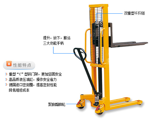 ◆ 手动液压堆高车是一种无污染,无动力的装卸产品,叉车自身重量轻,容易操作。