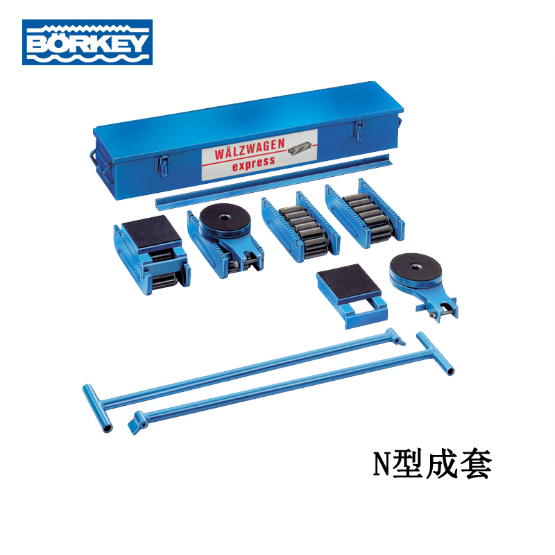●Borkey N型成套载重滚轮小车,由4个N型载重滚轮小车、2个转盘、2个承载板、2个转向杆、1个连接棍、1个金属箱组成。