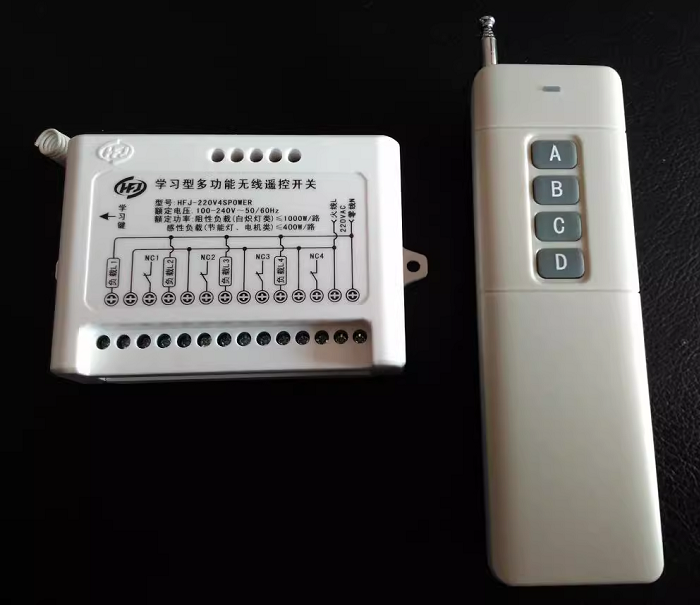 本公司设计、制造的多功能四路无线智能学习型遥控开关,为四个10A继电器输出开关量信号,所有遥控开关模块继电器接点独立输出,非常适合于直接控制各类负载;产品采用学习码无线编码技术,无方向性,开关互不干扰,可使要控制的设备或电机达到远程开关或通、断转换以及各种特殊控制程序的要求。主要应用于水泵、灯具无线遥控、电动门、窗、起吊设备、闸道、升降器、工业控制及安防行业等领域电气控制。