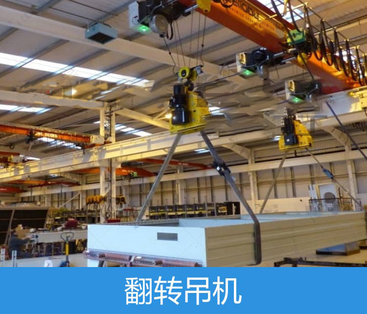 翻转吊机特点:①设备采用遥控运转,具有翻转异形大型物件不打滑,不倒旋等的特点。②具有对物体360°旋转功能,可按要求翻转至任意角度,操作简便,使用灵活可靠。 ③设备采用遥控控制,操作人员可远离翻转物品操作的特点,并具有轻起轻落翻转自如的特点。 ④设备具有移动功能,无需移动大型工件,可把设备移动至悬吊翻转物现场就可翻转。⑤设备采用回悬链条固定悬吊翻转物件,也可根据翻转物品的不规则形状及大小更换辅助链条或吊装带。⑥针对特殊物件可更换辅助槽型轮及吊装带,可使翻转物品无吊装痕迹。 ⑦使用该设备可提高翻转效率,可给用户大大降低成本。⑧该悬吊式翻转机可给行车配套使用,另外也可采用吊车野外现场翻转,只要吊得起该设备就可翻转自如,方便快捷。⑨该设备具有不受物件长度、宽度、大小形状的限制即可翻转。