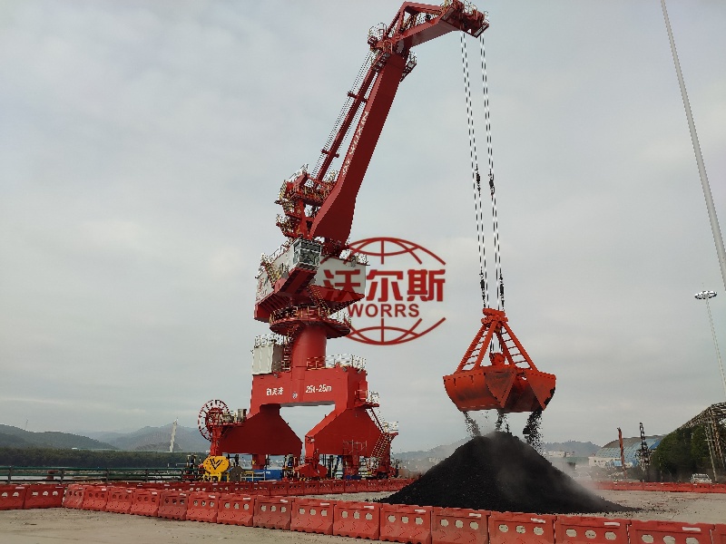 门座式煤炭起重机,为港口装卸散货及件杂货的全回转门座起重机,用于码头前沿。适用于岸线较长的码头,如船厂的船台、舾装码头和万吨级泊位散杂货码头等。一般采用单臂架钢丝绳变幅、单臂架齿条变幅或四连杆臂架齿条变幅结构形式,配用吊钩或抓斗装卸货物。其结构具有足够的强度、刚度、稳定性和抗疲劳性。各机构布局合理,传动平稳,操作灵活,维修方便,能适应吊钩和抓斗的作业要求。在规定幅度范围内,起吊额定载荷可作水平变幅和360度回转。起升、变幅、回转、行走机构可单独动作,也可联合动作。整机可沿水平铺设的轨道直线运行。该类产品具有工作幅度大、起升高度高、速度快、运转平稳可靠、作业效率高等特点。