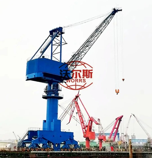 船坞门座式起重机,为港口装卸散货及件杂货的全回转门座起重机,用于码头前沿。适用于岸线较长的码头,如船厂的船台、舾装码头和万吨级泊位散杂货码头等。一般采用单臂架钢丝绳变幅、单臂架齿条变幅或四连杆臂架齿条变幅结构形式,配用吊钩或抓斗装卸货物。其结构具有足够的强度、刚度、稳定性和抗疲劳性。各机构布局合理,传动平稳,操作灵活,维修方便,能适应吊钩和抓斗的作业要求。在规定幅度范围内,起吊额定载荷可作水平变幅和360度回转。起升、变幅、回转、行走机构可单独动作,也可联合动作。整机可沿水平铺设的轨道直线运行。该类产品具有工作幅度大、起升高度高、速度快、运转平稳可靠、作业效率高等特点。