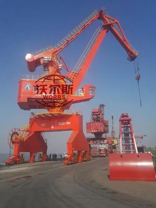 船厂门座式起重机,为港口装卸散货及件杂货的全回转门座起重机,用于码头前沿。适用于岸线较长的码头,如船厂的船台、舾装码头和万吨级泊位散杂货码头等。一般采用单臂架钢丝绳变幅、单臂架齿条变幅或四连杆臂架齿条变幅结构形式,配用吊钩或抓斗装卸货物。其结构具有足够的强度、刚度、稳定性和抗疲劳性。各机构布局合理,传动平稳,操作灵活,维修方便,能适应吊钩和抓斗的作业要求。在规定幅度范围内,起吊额定载荷可作水平变幅和360度回转。起升、变幅、回转、行走机构可单独动作,也可联合动作。整机可沿水平铺设的轨道直线运行。该类产品具有工作幅度大、起升高度高、速度快、运转平稳可靠、作业效率高等特点。